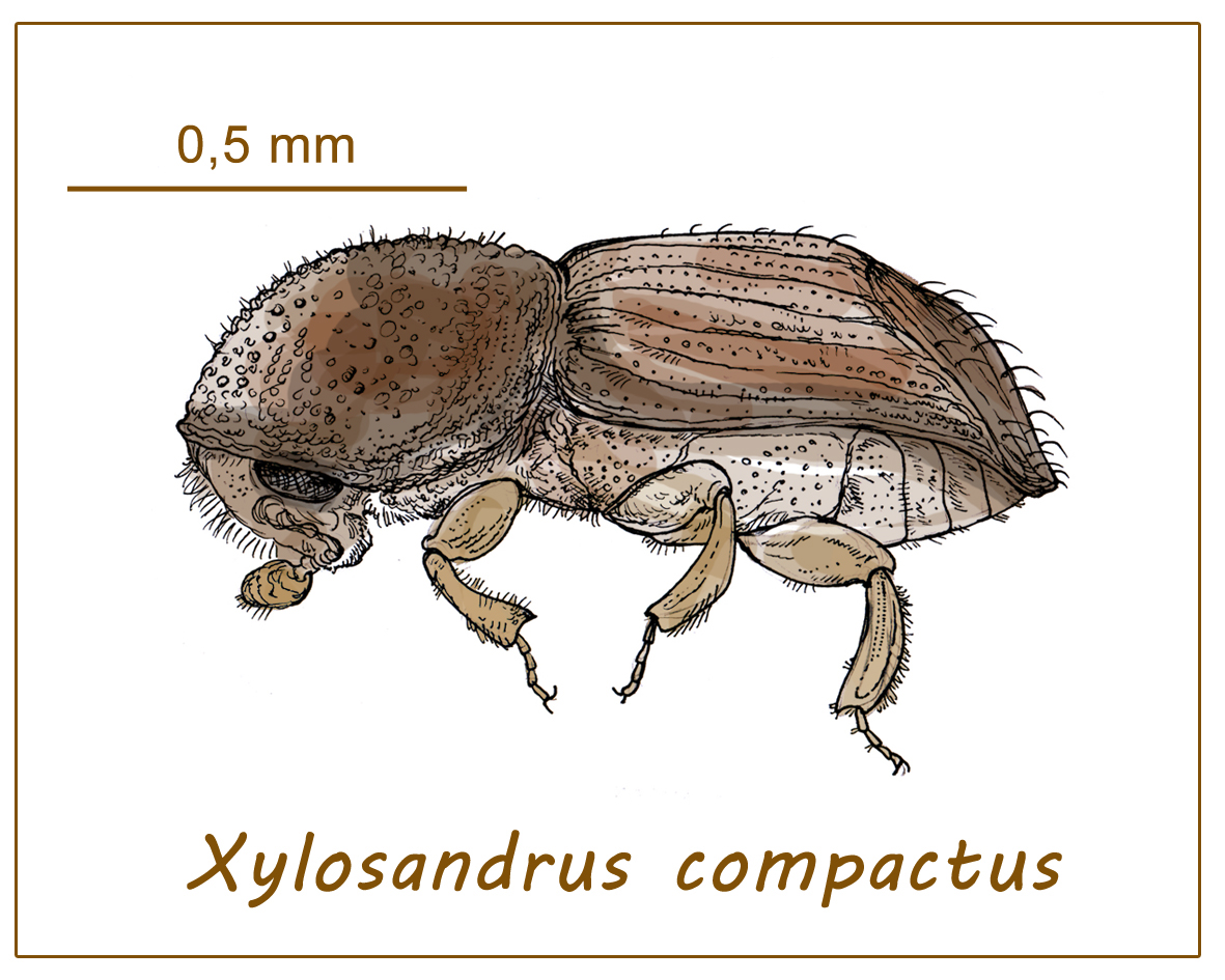 És un escarabat polífag associat amb fongs que excava galeries a les branques per allotjar-hi els fongs simbionts que conrea i dels quals s’alimenten les larves. El resultat es la debilitació i l’assecament dels arbres. Pot infestar una àmplia varietat de plantes llenyoses i cultius econòmicament importants. Destaca la seva afecció al garrover (Ceratonia siliqua).