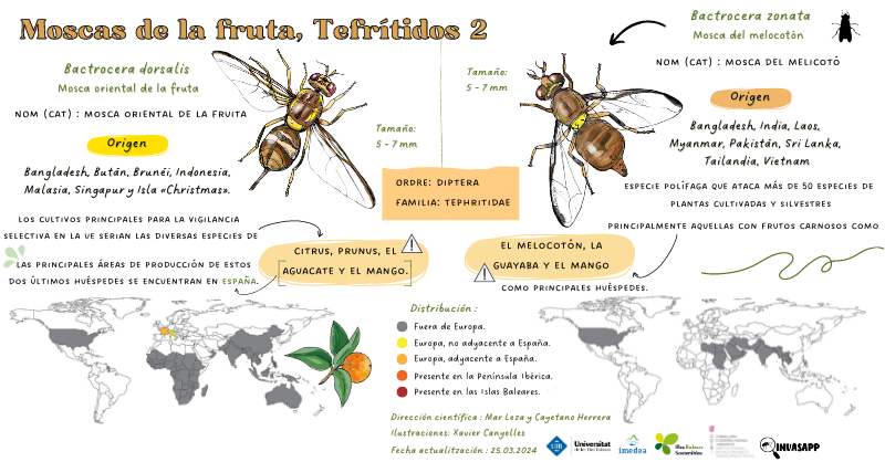 Especie polífaga que ataca más de 50 especies de plantas cultivadas y silvestres, principalmente aquellas con frutos carnosos, entre ellos, el melocotón, la guayaba y el mango son los principales huéspedes.
