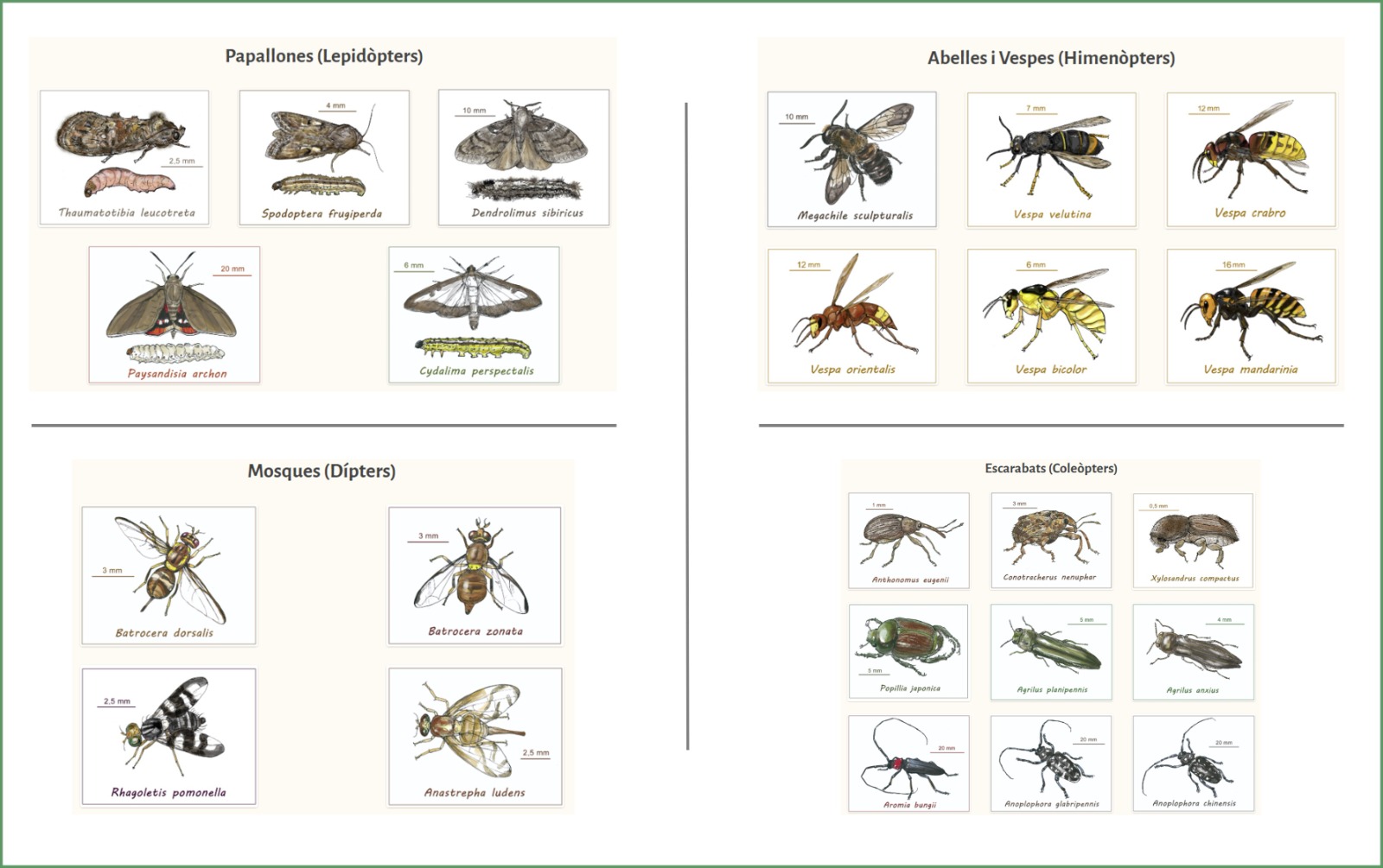 Escarabats (Coleòpters) Abelles i Vespes (Himenòpters) Mosques (Dípters) Papallones (Lepidòpters)