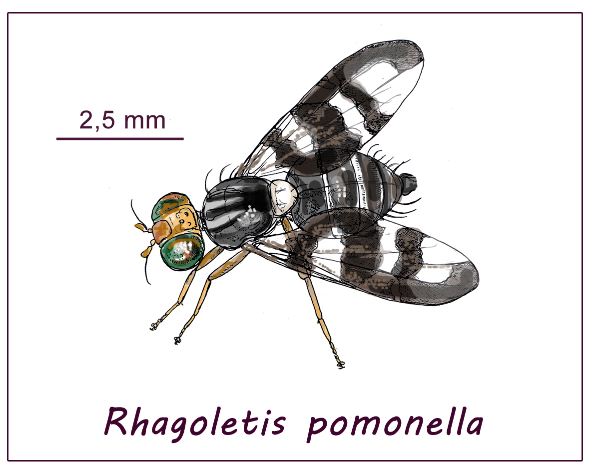 Nom científic: Rhagoletis pomonella Grandària: 4-7 mm Origen: Amèrica del Nord (Canadà, Estats Units i Mèxic) Nom (ES): mosca de la manzana Descripció: Plaga important de cultius de pomera.